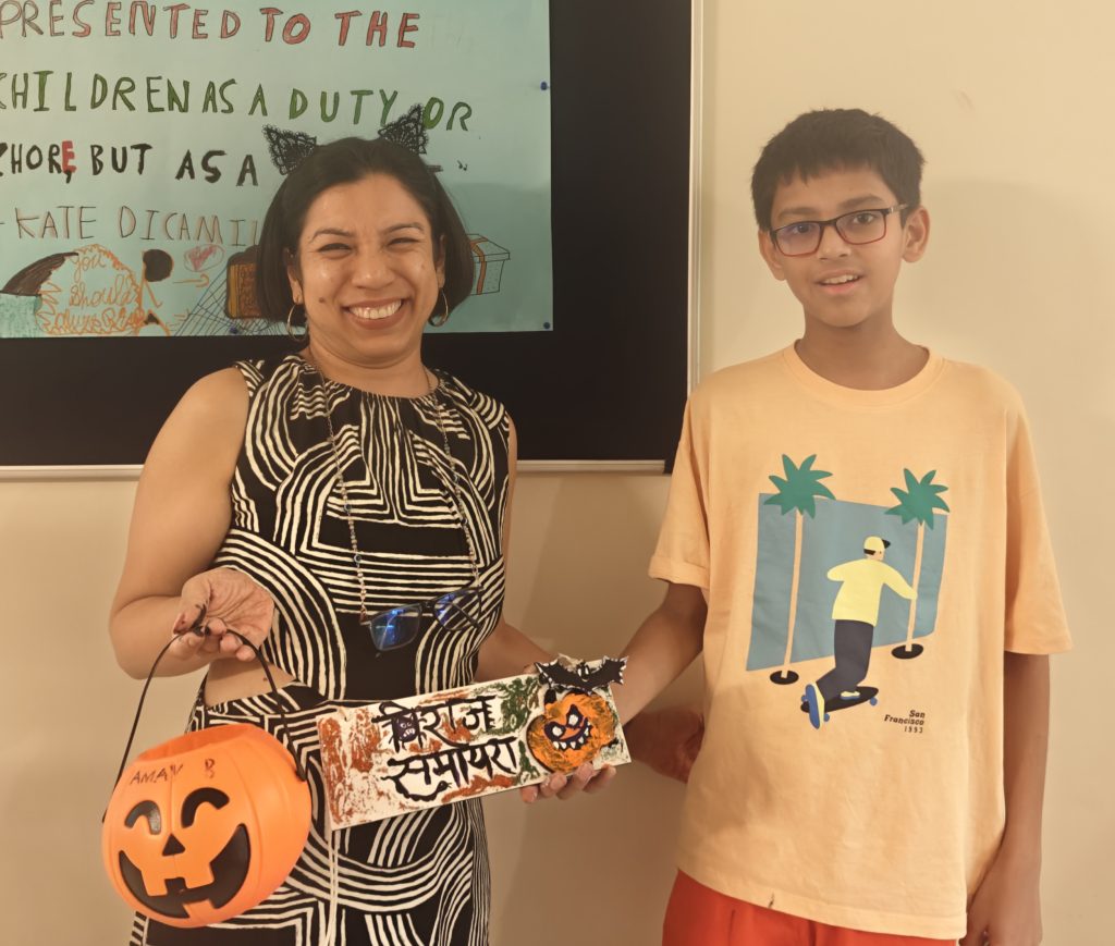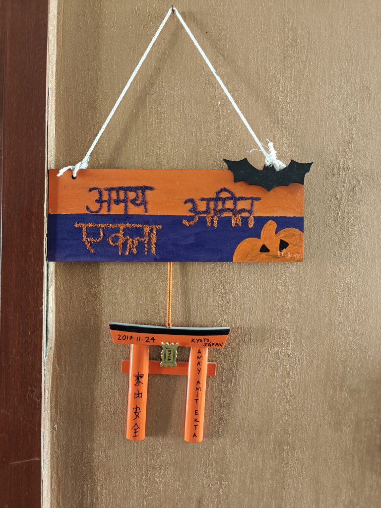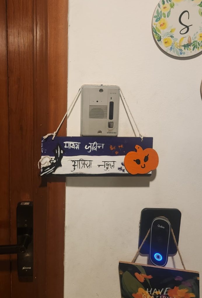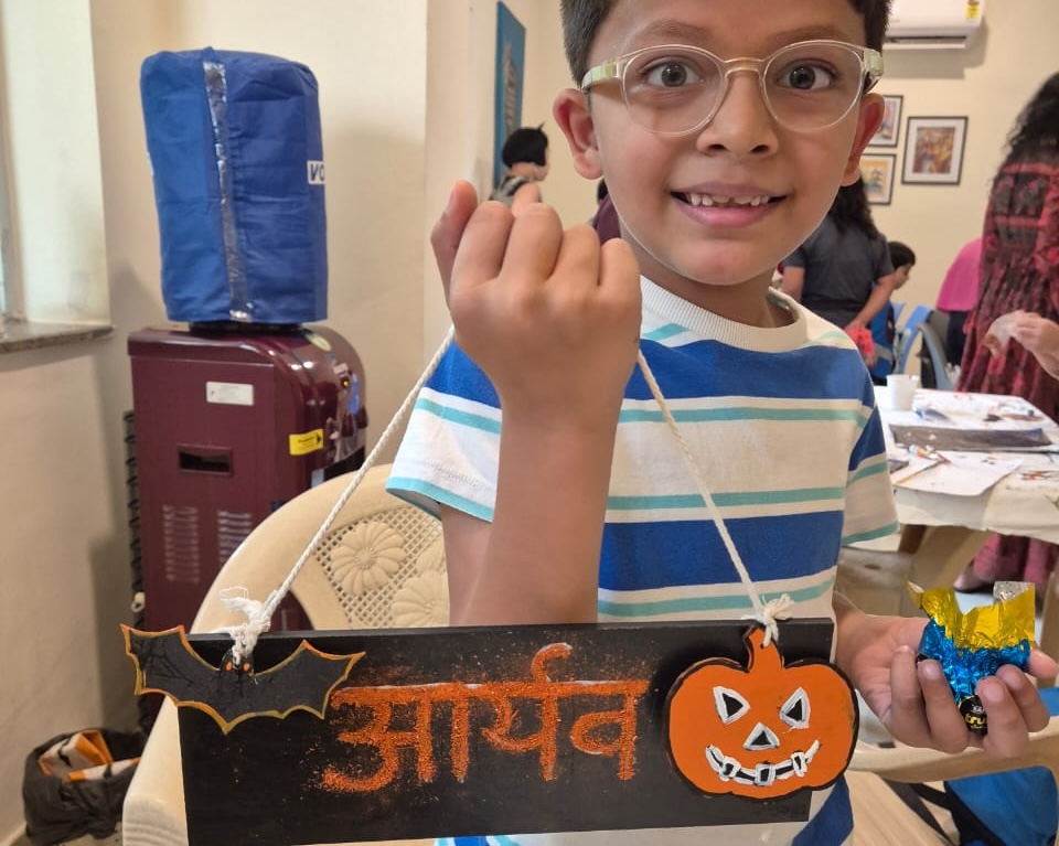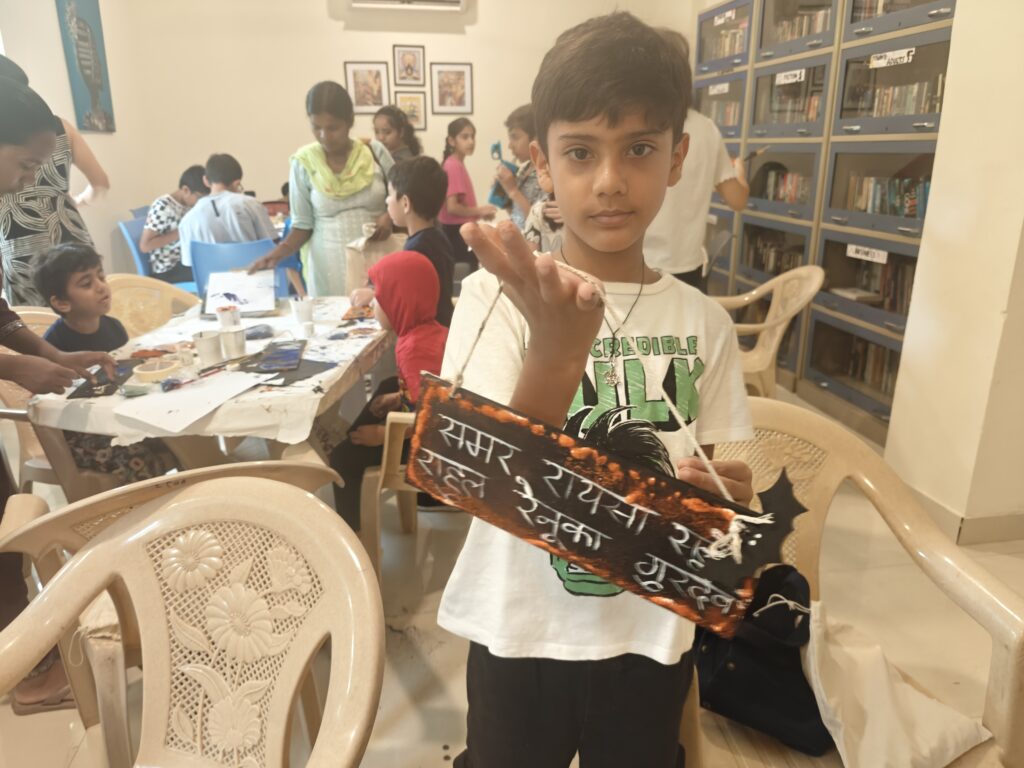 I brought together a group of 20 enthusiastic children, aged 6 to 12, to design Halloween-themed Hindi door plates for their homes and rooms. Watching these kids unleash their creativity was an absolute joy. Some children opted to write their names on their door plates, while others showed great excitement in learning and writing the names of their siblings, parents, and even grandparents along with their own names in Hindi to create special family door plates.